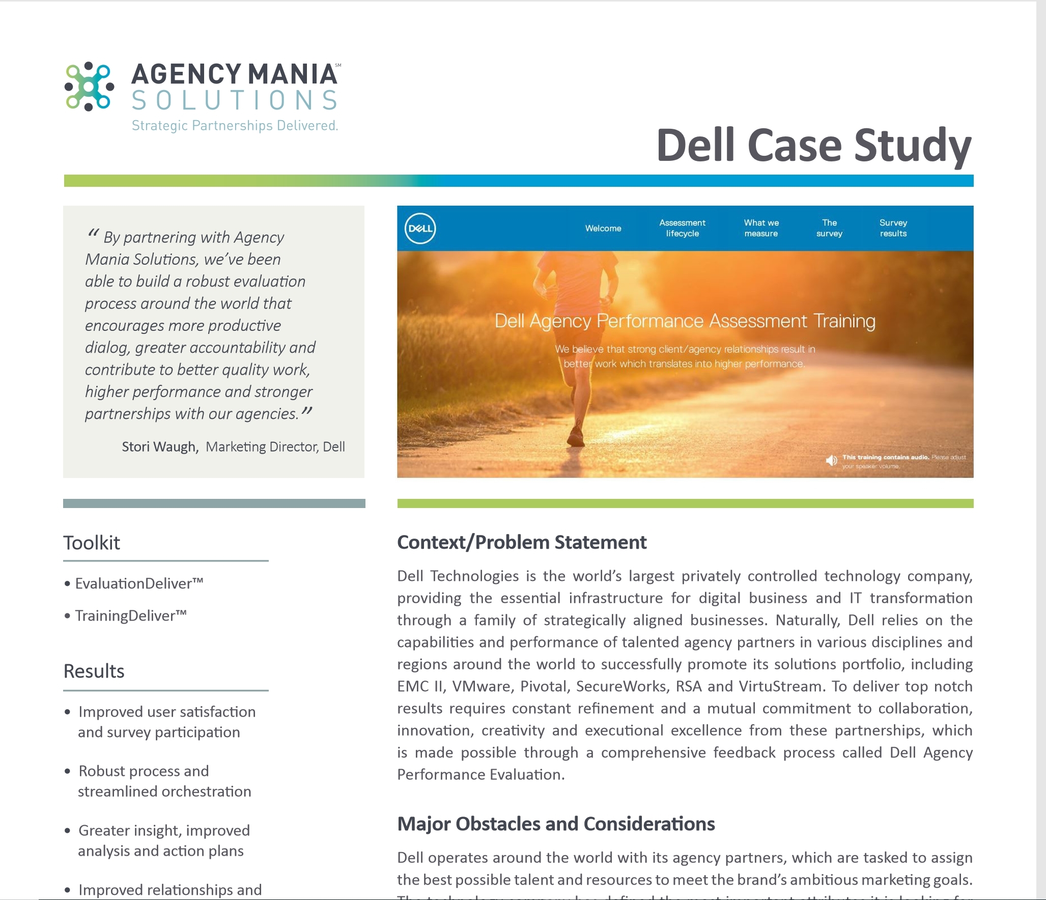 Dell asked Agency Mania Solutions to uplevel its existing client/agency performance evaluation process to a whole new level of insight and action planning. In close partnership with the Dell Agency Management team, Agency Mania Solutions revamped the end-to-end process, using its EvaluationDeliver™ solution, to bring much greater focus on the analysis and set of recommendations that would ultimately contribute to relationship improvements and better work. Dell also developed and launched a global Dell Performance Assessment curriculum using TrainingDeliver™ to enhance the perceived value and overall quality of the input provided by agencies and Dell client teams.