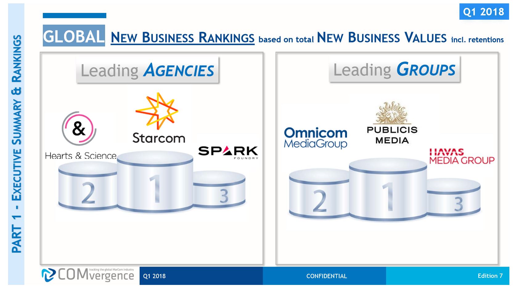 - Based on new business activity in media in Q1, the leading agency is Starcom and the leading media group is Publicis Media.