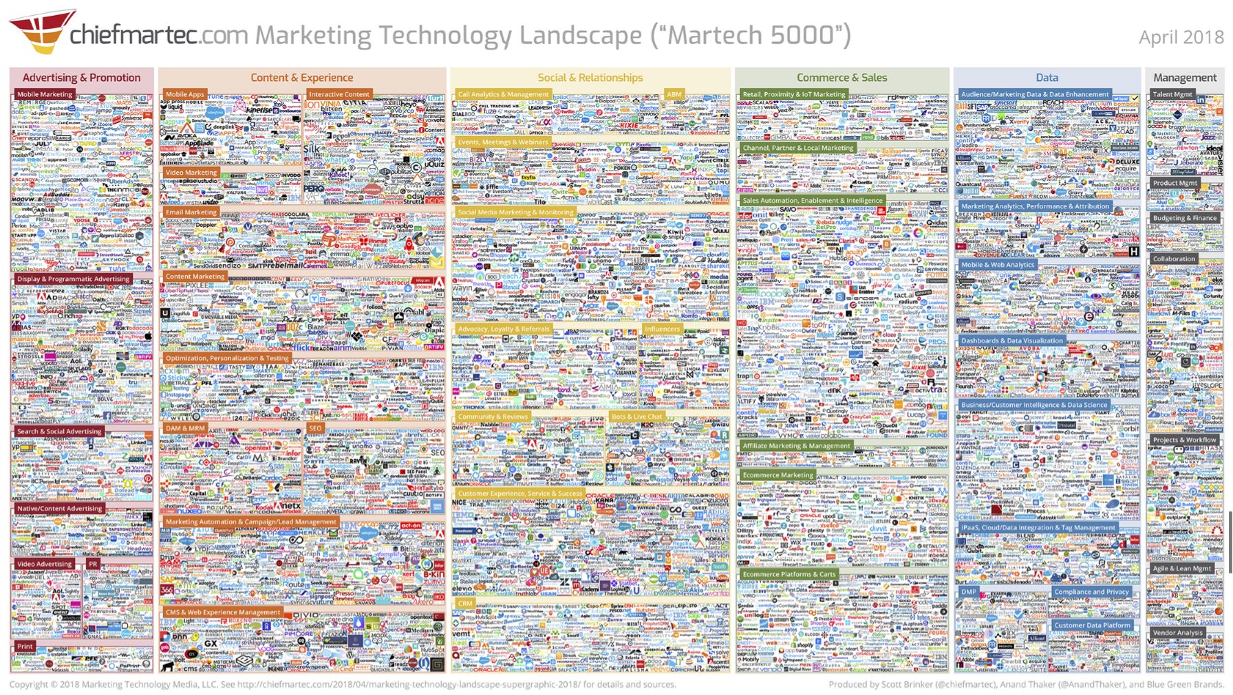 - Per Chiefmartec.com, the Marketing Technology Landscape has now over 5,000 brands across marketing categories and is an eye-chart for most people. Expect your eyes (and the chart) to get worse over time.