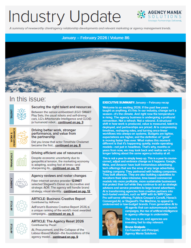 Welcome to an exciting 2026. If the past few years taught us anything, it’s this: In our industry, change isn’t a season—it’s the climate. And right now the temperature is rising. The agency business is undergoing a profound reinvention. Not a refresh. Not a rebrand. A structural shift in how work is produced, value is measured, talent is deployed, and partnerships are priced. AI is compressing timelines, reshaping roles, and turning once-linear workflows into always-on systems. Budgets are tighter, expectations are higher, and the definition of “great” is moving faster than ever. What makes this moment different is that it’s happening quietly, inside operating models—not just in headlines. That’s why, months or years from now, we may look back and realize we’re no longer talking about the same agency industry at all.